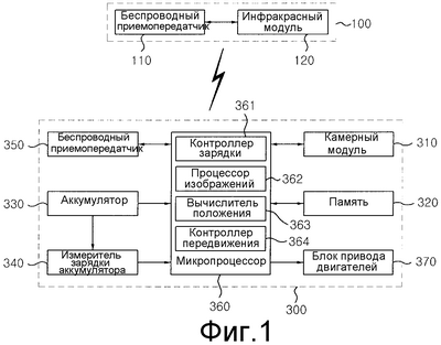 В другом варианте осуществления беспроводный приемопередатчик 110 может быть воплощен согласно схеме инфракрасной связи с помощью инфракрасных сигналов. В этом варианте осуществления зарядное устройство 100 выполняет обмен данными с самоходным роботом 300 через инфракрасный модуль 120, который включает в себя инфракрасный передатчик для наложения заданного сигнала на инфракрасный свет и излучения этого инфракрасного света и инфракрасный приемник для демодуляции принятого инфракрасного света, а самоходный робот 300 передает и принимает различные данные через модуль инфракрасной связи, соответствующий инфракрасному модулю 120 зарядного устройства 100. Конкретнее, модуль инфракрасной связи самоходного робота 300 включает в себя инфракрасный передатчик для наложения заданного сигнала на инфракрасный свет и излучения этого инфракрасного света и инфракрасный приемник для демодуляции принятого инфракрасного света. Такая инфракрасная связь известна в технике, а потому ее подробное описание здесь опущено.
