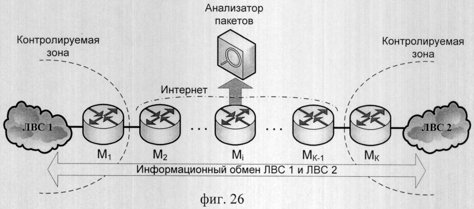 Такое наблюдение позволило однозначно определить установленный между маршрутизаторами M1 и Мk защищенный канал связи. Следовательно, можно предположить, что нарушитель с высокой вероятностью мог бы, используя анализатор пакетов на маршрутизаторе Mi, определить структуру распределенной ВС, как это представлено на фиг.27а, что противоречит требованию по скрытности канала связи. Таким же образом нарушитель мог бы осуществить деструктивные воздействия на маршрутизаторы M1 и Мk с целью нарушить информационный обмен, что противоречит требованию по безопасности канала связи.