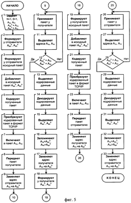 5. Способ защиты канала связи вычислительной сети, заключающийся в том, что предварительно задают исходные данные, включающие адреса отправителя и получателя сообщений, формируют у отправителя исходный пакет данных, кодируют его, преобразуют в формат ТСР/IP, включают в него текущие адреса отправителя и получателя, передают сформированный информационный пакет сообщений получателю, из принятого у получателя пакета сообщений выделяют адреса отправителя и получателя, сравнивают их с предварительно заданными текущими адресами, при их несовпадении принятые пакеты не анализируют, а при совпадении из принятого пакета сообщений выделяют кодированные данные и декодируют их, отличающийся тем, что в предварительно заданные исходные данные дополнительно включают базу из N адресов отправителя и S адресов получателя, назначают из заданной базы текущие адреса отправителя Ато и получателя Атп, запоминают их, а также задают у отправителя и получателя функции выбора текущего адреса отправителя FN(i) и получателя FS(i), где i=1, 2, 3, …, в соответствии с которыми на i-м шаге назначают новые текущие адреса, устанавливают равным единице номера шагов смены адресов io=1 и iп=1, после передачи от отправителя к получателю информационного пакета формируют у отправителя информацию о новых текущих адресах отправителя Ато i и получателя Атп i, для чего назначают у отправителя из заданной базы адресов в соответствии с предварительно заданными функциями выбора новые текущие адреса отправителя Ато i=FN(i) и получателя Aтп i=FS(i) и запоминают их в качестве текущих адресов отправителя Ато и получателя Атп, а затем заменяют у отправителя его текущий адрес Ато на новый текущий адрес отправителя Ато i и увеличивают номер шага io на единицу (io=io+1), после выделения у получателя из принятого информационного пакета сообщений кодированных данных и декодирования их, формируют у получателя информацию о новых текущих адресах отправителя Ато i и получателя Атп i, для чего назначают у получателя из заданной базы адресов в соответствии с предварительно заданными функциями выбора новые текущие адреса отправителя Ато i=FN(i) и получателя Атп i=FS(i) и запоминают их в качестве текущих адресов отправителя Ато и получателя Атп, затем у получателя заменяют его текущий адрес на новый текущий адрес получателя Aтп i и увеличивают номер шага iп на единицу (iп=iп+1), после чего повторно формируют у отправителя информационный пакет сообщений.