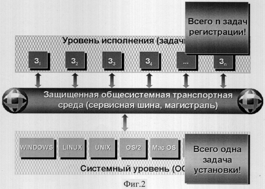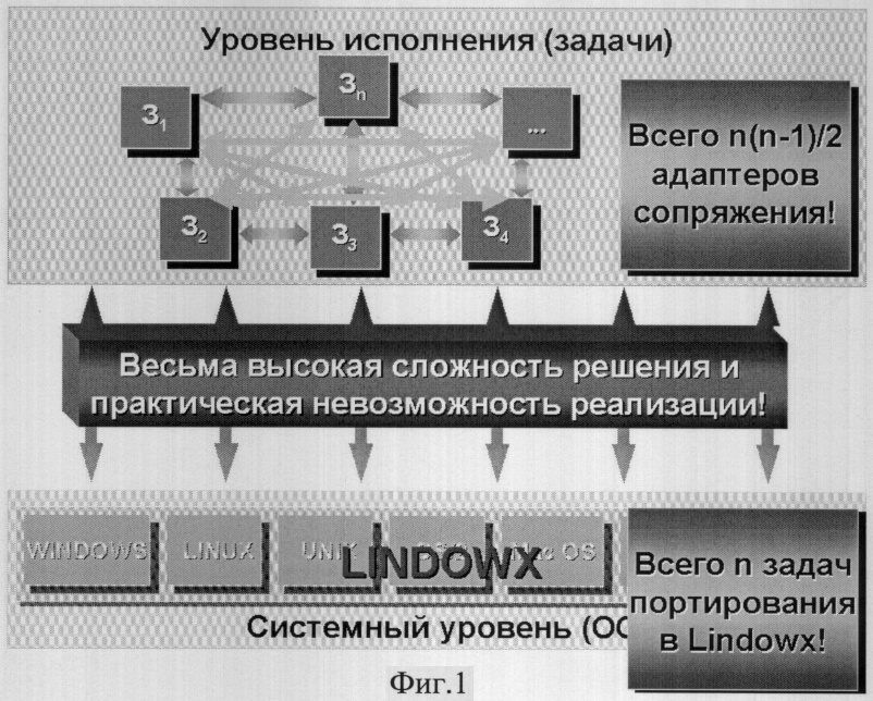Рассмотрим первый уровень (нижняя часть фиг.1) подробнее. К безусловным лидерам в этой области можно отнести ОС семейства MS Windows. Далее следуют: UNIX – подобные ОС Linux в разных вариантах (Red-Hat, SuSE, TurboLinux, Mandrake, Debian и прочие зарубежные варианты, а также МС ВС, ASP и ALTLinux в России), UNIX-системы – FreeBSD, Sun Solaris, HP-UX, IBM AIX и пр., IBM OS/2 в разных вариантах, устаревший, но еще применяющийся продукт Mac OS/X, IBM AS/400, IBM VM/ESA и пр. Существует еще ряд известных продуктов, как устаревших, например MS DOS и ее аналог PTS DOS, так и перспективных, применяемых в секторе мобильных решений, – PalmOS, Simbian, Windows CE, Pocket PC и пр. Все эти ОС условно названы на фиг.1 термином «Lindows». Отметим, что интеграция на этом уровне связана с организацией взаимодействия на уровне ОС, что в силу их достаточных различий и организационных сложностей практически неосуществимо. Поэтому общий подход здесь следующий: постепенное «вытеснение» разрозненных ОС некоторой выбранной системой, ее всестороннее развитие, поддержка и генерация новых решений на этой новой платформе. При этом интеграцию большого числа функциональных задач в единое информационное пространство стараются, как правило, выполнять на основании разработки протоколов сопряжения на уровне среды исполнения, а дальнейшее развитие систем осуществлять на основании унификации как программных, так и технических средств. Однако для интеграции тысяч задач просто физически невозможно написать, а потом синхронизировать работу более 1.000.000 протоколов сопряжения. Следовательно, без внесения изменений в архитектуру уже созданных систем их интеграция практически невозможна.