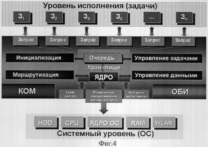 На фиг.3 проиллюстрирована технология интеграции различных СЗИ АС, а на фиг.4 эта же технология показана для случая интеграции промышленных систем. Основная идея заключается в том, чтобы ввести некоторого арбитра, который будет заниматься сопоставлением грифов и профилей должностных лиц. Этот арбитр работает в правовом поле РФ в соответствии с законодательством и привычным для нас ранжированием. На этом и на следующем чертежах сокращения КОМ и ОБИ означают, соответственно, коммуникационную подсистему и подсистему обеспечения безопасности информации. На фиг.4 введены также следующие обозначения: MS SQL Server, Oracle и Informix – названия систем управления базами данных (СУБД) зарубежного производства, ADO (ActiveX Data Objects) и ODBS (Open DataBase Connectivity) – универсальные интерфейсы подключения к СУБД, XML (eXtensible Markup Language) – универсальный расширяемый язык разметки гипертекстовых данных.
