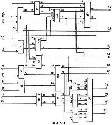 На фиг.1 также показаны первый 17, второй 18, третий 19, четвертый 20 и пятый 21 информационные входы системы, первый 22, второй 23, третий 24, четвертый 25 и пятый 26 синхронизирующие входы системы, а также первый 27 и второй 28 адресные выходы системы, информационный 29 и сигнальные 30-33 выходы системы, первый 34, второй 35 и третий 36 синхронизирующие выходы системы.
