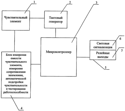 Устройство состоит из чувствительного элемента 1, подключенного к тактовому генератору периодических сигналов 2, который сопряжен с микроконтроллером 3. В состав устройства также входит блок 4 измерения емкости чувствительного элемента, измерения сопротивления заземления, автоматической подстройки чувствительности и тестирования работоспособности и блок 5 выдачи сигналов. Блок 5 выдачи сигналов состоит из устройства световой сигнализации 6 и релейных выходов 7 для связи с прибором приемно-контрольным. Блок 4 включает в себя тестовые емкости и устройства их подключения.