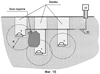 Третий или четвертый вариант устройства может быть также применен для обнаружения подкопа под инженерными сооружениями (фиг.15). Для этой цели на охраняемом объекте делаются шурфы и в них устанавливаются сейсмоприемники 1 (при необходимости на разной глубине). При попытке осуществления подкопа, проходящего через зоны обнаружения сейсмоприемников 1, третий или четвертый вариант устройства формирует сигнал тревоги.