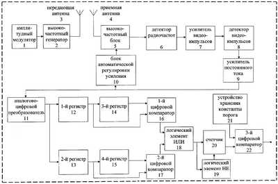 Устройство работает следующим образом. Высокочастотный генератор 2 вырабатывает высокочастотные колебания метрового диапазона радиоволн, которые модулируются амплитудным модулятором 1 и излучаются передающей антенной 3. Через приемную антенну 4 высокочастотные колебания, излученные передатчиком, поступают на высокочастотный блок 5, где они усиливаются и фильтруются. Детектор радиочастот 6, преобразует высокочастотные колебания в сигнал промежуточной частоты, который затем усиливается и преобразуется в последовательность видеоимпульсов с частотой модуляции. Эта последовательность через усилитель видеоимпульсов 7 поступает на детектор видеоимпульсов 8, где выделяется огибающая этой последовательности видеоимпульсов. Усилитель постоянного тока 9 усиливает эту огибающую до необходимого уровня. Огибающая последовательности видеоимпульсов поступает в блок автоматической регулировки усиления 10 и на аналогово-цифровой преобразователь 11. Блок автоматической регулировки усиления 10 отфильтровывает слабо меняющуюся составляющую огибающей, пропорциональную уровню входного сигнала, который затем усиливается до необходимого уровня и поступает на высокочастотный блок. Аналогово-цифровой преобразователь 11 преобразует текущее значение амплитуды в цифровой код. Выходной сигнал аналогово-цифрового преобразователя 11 в виде цифрового кода поступает на 1-й регистр 12 и записывается в него, если пришедшее текущее значение больше, чем уже имеющееся в регистре. Выходной сигнал аналогово-цифрового преобразователя 11 также поступает на 2-й регистр 13 и записывается в него, если текущее значение цифрового кода меньше, чем уже имеющееся в регистре. С выхода 1-го регистра 12 цифровой код поступает на 3-й регистр 14. Как только текущее значение цифрового кода становится меньше, чем записанное в 1-м регистре 12, или больше, чем записанное в 2-м регистре 13, то фиксируется достижение текущим значением максимума или минимума соответственно. При этом в случае фиксации достижения текущим значением максимума происходит сравнение на 1-м цифровом компараторе 16 содержимого 1-го регистра 12 с содержимым 3-го регистра 14 на предмет превышения содержимым 3-го регистра максимумов 14 величины содержимого 1-го регистра 12. После чего производится запись содержимого 1-го регистра 12 в 3-й регистр 14, а во 2-й регистр 13 производится запись текущего значения цифрового кода. Или в случае фиксации достижения текущим значением минимума происходит сравнение на 2-м цифровом компараторе 17 содержимого 2-го регистра 15 с содержимым 4-го регистра 15 на предмет превышения содержимым 2-го регистра 13 величины содержимого 4-го регистра 15. После чего производится запись содержимого 2-го регистра 13 в 4-й регистр 15, а в 1-й регистр 12 производится запись текущего значения цифрового кода. Сигналы 1-го цифрового компаратора 16 и 2-го цифрового компаратора 17 объединяются логическим элементом типа ИЛИ 18 и при выполнении выше оговоренных условий о сравнении содержимого регистров поступают на счетчик 20, который добавляет к своему содержимому единицу. При невыполнении выше оговоренных условий о сравнении содержимого регистров сигнал с выхода элемента типа ИЛИ 18 поступает через логический элемент типа НЕ 19 на вход сброса счетчика 20, обнуляя его содержимое. Выходной сигнал счетчика 20 поступает н