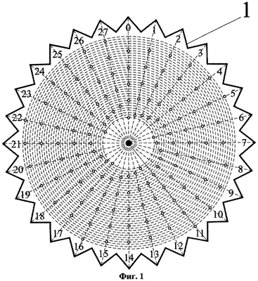 На фиг.1 приведено изображение предпочтительного варианта конструктивного исполнения диска 1 с метками в виде зубчатого колеса с 28-го зубьями, последовательно пронумерованными по часовой стрелке от 0 до 27.