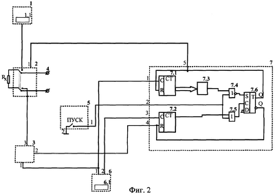 В исходном состоянии контакты тумблера “Пуск” в блоке управления устройством 5 разомкнуты. На S-входе триггера 7.6 устанавливается с выхода логического элемента “ИЛИ-НЕ” 7.4 низкий логический уровень. Это приводит к установлению на прямом выходе Q триггера 7.6 высокого логического уровня, который запрещает переключение релейного блока 2. На инверсном выходе триггера 7.6 в это время устанавливается низкий логический уровень, который разрешает работу счетчика времени индикации 7.2 и запрещает прохождение импульсов с формирователя импульсов 6 на релейный блок 2. В этом состоянии устройства регулируемый резистор Rx соединен через нормально замкнутые контакты переключательной группы релейного блока 2 с цепью измерения сопротивления 4.