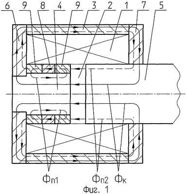При расположении постоянного магнита 8 на сердечнике 4 (фиг.1), когда катушка 1 выключена, большая часть Фп1 поляризующего магнитного потока, создаваемого постоянным магнитом 8, замыкается через примыкающие к торцевым поверхностям постоянного магнита 8 магнитные шунты 9 и охватываемую постоянным магнитом 8 часть сердечника 4, так как этот путь имеет наибольшую магнитную проводимость по сравнению с параллельным путем через магнитный шунт 9, примыкающий к торцевой поверхности постоянного магнита 8 со стороны опорного фланца 6, опорный фланец 6, корпус 3, проходной фланец 7, якорь 5, рабочий воздушный зазор 2, магнитный шунт 9, примыкающий к торцевой поверхности постоянного магнита 8 со стороны рабочего воздушного зазора 2, по которому проходит меньшая часть Фп2 потока поляризующего постоянного магнита 8. Так как магнитный поток Фп2, проходящий через рабочий воздушный зазор 2, при выключенной катушке 1 незначителен, создаваемое электромагнитом усилие не может преодолеть усилие возвратной пружины (на чертеже не показана) и якорь 5 остается неподвижным.