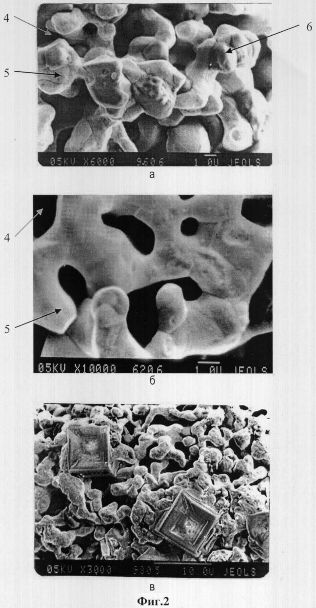 На представленных чертежах хорошо видно, что порошок состоит из пористых частиц – 1 (фиг.1a) преимущественно округлой формы. Внутренняя структура частиц имеет разветвленное дендритообразное строение и ветви дендритов – 2 (фиг.1б, в), срастаясь формируют пространственный каркас частицы. Внутричастичные поры – 3 (фиг.1б, в) имеют величину 3-8 мкм, преимущественно, и при этом величина межкристаллитных пор – 4 (фиг.2а, б) составляет 0,5-3 мкм. Кристаллы серебра – 5 (фиг.2а, б) имеют неправильную форму и срастаются в дендритообразные фрагменты величиной до 10-15 мкм.