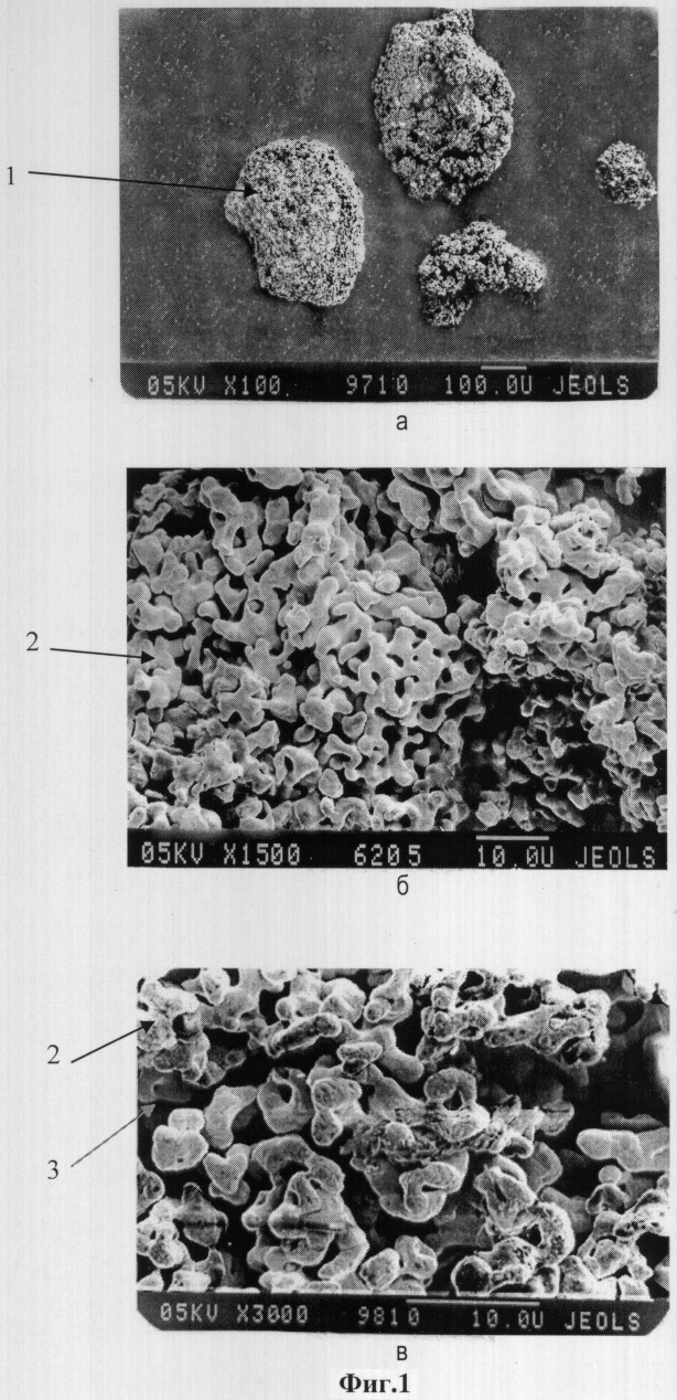 На фиг.1 представлена структура частиц серебряного порошка: а -общий вид частиц, излом частиц порошка, их внутреннее строение – б, в. Увеличение: а – 100; б – 1500; в – 3000.
