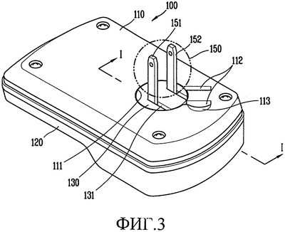 Как показано на фиг.4 и 6, паз для ввода пальца 113 предпочтительно образован в пазу для приема контакта 112, чтобы позволить пользователю удобно извлечь штепсельную вилку в сборе 150, когда она находится в сложенном положении. Глубина паза для ввода пальца 113 достаточна для того, чтобы палец пользователя вошел в контакт со штепсельной вилкой в сборе 150, находящейся в сложенном положении. В предпочтительном примере ширина паза для ввода пальца 113 составляет примерно 10 мм.