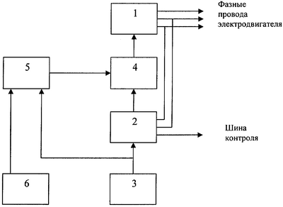 Со статического преобразователя 1 тока на фазные провода асинхронного электродвигателя поступает переменное напряжение и ротор начинает вращаться. Блок 2 управления периодически на короткое время отключает статический преобразователь 1 тока от электродвигателя. В этом случае ротор электродвигателя продолжает вращаться по инерции (на выбеге) и индуцирует ЭДС, которая поступает на блок 2 управления, обрабатывается и в случае полного разгона двигателя на шину контроля выдает сигнал исправности. Если по каким-либо причинам частота вращения двигателя снижается до определенной величины, то блок 2 управления выдает на шину контроля сигнал отказа. Работа блока 2 управления синхронизируется генератором 3, подключенным к нему.
