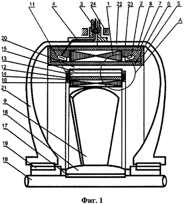 где hнар, hраб, hвн – толщины наружного, рабочего и внутреннего цилиндров;  , 2, 3 – глубины проникновения магнитного поля в соответствующий цилиндр; – угловая частота, 0=4 ·10-7 Гн м – магнитная постоянная; sн – номинальное скольжение, – гармоника поля высокого порядка; s – скольжение -й гармоники поля, что достигается при параметрах материала 1=(1,8-2,5)10-7 Ом м, r =90-120. Для дополнительного увеличения сопротивления на поверхности цилиндра нанесена многозаходная винтоканавочная нарезка, канавки глубиной hк= , шириной ак=0,7-1,0 мм, с шагом вк=3,0-3,5 мм. Лопасти гребного винта (9) закреплены в верхней части в расточке ротора, а в центральной части – на шейке ротора (16) с фиксацией шпонкой (17), и вращаются вместе с валом (18) в двух опорно-упорных подшипниках скольжения (19), выполненных из специальных материалов, предназначенных для работы в морской воде. Центрирование вращающегося ротора в расточке статора с зазором (20) осуществляется подшипниковыми щитами, выполненными в форме стаканов, боковые ребра (21) которых имеют обтекаемое сечение, а корпуса (22) этих щитов полностью охватывают сборку статора. Между сборкой статора и корпусами щитов расположена вставка (23) из вибродемпфирующего материала. Крепление гребной установки к корпусу объекта выполнено с помощью штанг (24), обеспечивающих возможность ее поворота на 180° относительно вертикальной оси.