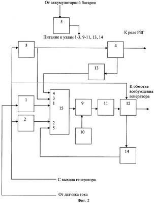 Предлагаемое устройство (фиг.2), как и прототип, содержит ограничитель тока 1, соединенный с датчиком тока, измеритель регулятора 2, измеритель защиты 3, соединенный с усилителем защиты 4, управляющим реле защиты генератора, а также питающий делитель 5, соединенный с аккумуляторной батареей. Вход измерителя регулятора 2 и вход измерителя защиты 3 соединены с выходом генератора.