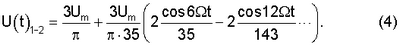Разложим в ряд Фурье трехфазное выпрямленное напряжение на выходе моста при разомкнутом ключе, между точками Т1 и Т2 (фиг.1):