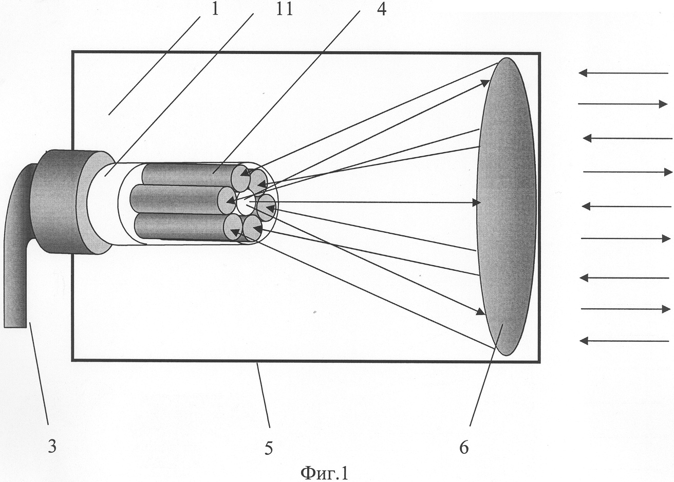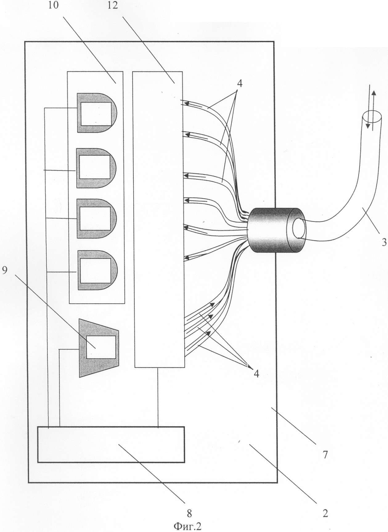 Концы световодов 4, расположенные во внешнем блоке 1 (см. фиг.1), объединены в один пучок плотной сборки, образующий волоконно-оптический коллектор 11, а другие концы световодов 4, помещенных в кабель 3, расположены во внутреннем блоке 2 и оптически соединены с одним источником оптического излучения 9 и приемниками оптического излучения 10 с возможностью коммутации (см. фиг.2) посредством коммутатора 12, расположенного во внутреннем блоке 2.