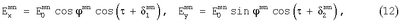 что соответствует сохранению в каждой из компонент и исходной линейной поляризации, характерной для электрического вектора полного светового потока. Исключение несущей из выражения (12) посредством стандартных тригонометрических преобразований ведет к соотношениям