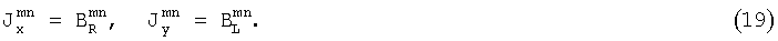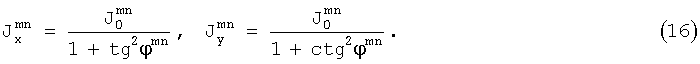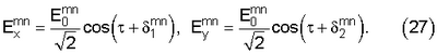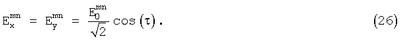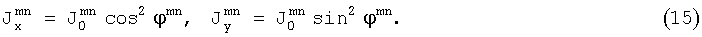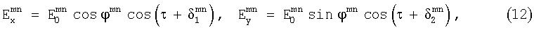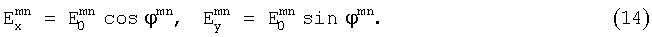 Первый частный вариант способа реализуется следующим образом. Изменение угла mn наклона направления линейной поляризации в mn-м элементе поперечного сечения светового потока приводит к следующим соотношениям для x- и y-компонент и электрического вектора световой волны (11)