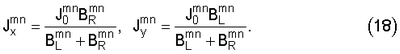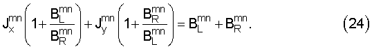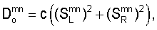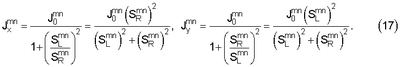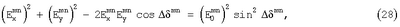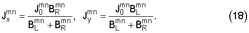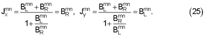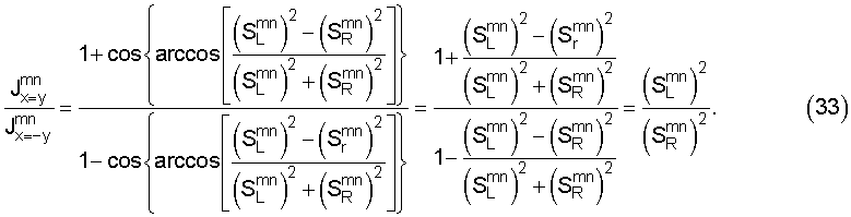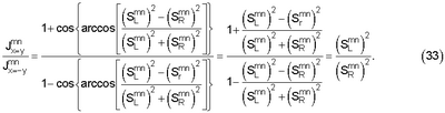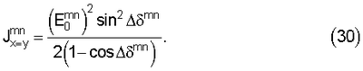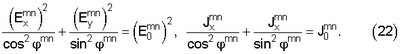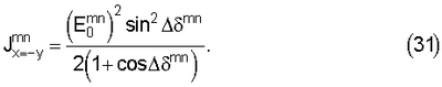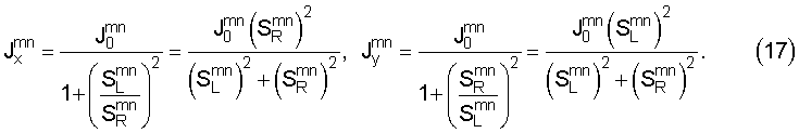 Определим связь между соответствующими величинами интенсивности светового потока, поскольку глаза наблюдателя воспринимают изображения ракурсов посредством реакции на интенсивность света. Полная интенсивность светового потока в mn-м элементе его поперечного сечения определяется квадратом величины полной амплитуды электрического вектора световой волны: , а соответствующие компоненты и интенсивности светового потока равны и . После возведения обеих частей уравнений (14) в квадрат получатся искомые соотношения между величинами интенсивности двух составляющих светового потока светового потока