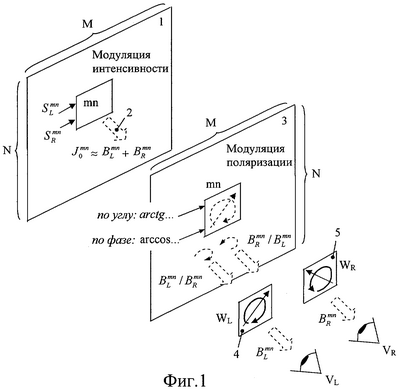 с помощью управляемого поляризатора 3 осуществляют эллиптическую поляризационную модуляцию светового потока 2 в соответствии с обратными тригонометрическими функциями arctg или arcctg от отношения сигналов и либо arccos или arcsin от отношения линейных комбинаций и , где и – сигналы, квадраты амплитуд которых соответствуют величинам и интегральной яркости mn-х элементов изображений соответственно левого и правого ракурсов, при этом первому и второму граничным значениям параметров эллиптической поляризационной модуляции соответствуют первое и второе взаимно ортогональные поляризационные состояния светового потока, в соответствии с первым из которых выделяют в левом окне WL наблюдения первую составляющую светового потока, пропорциональную (с помощью первого анализатора эллиптической поляризации), а в соответствии со вторым из которых в правом окне WR выделяют вторую составляющую светового потока, пропорциональную (с помощью второго анализатора эллиптической поляризации), где m=1, 2, …, М, n=1, 2, …, N, a M×N – полное число элементов (пикселей) в изображении каждого из ракурсов.