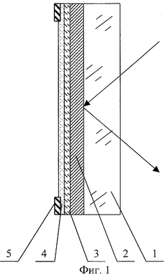 На фиг.1 схематически представлено в разрезе заявляемое зеркало с обогревом. Оно состоит последовательно из стеклянной подложки 1, отражающего слоя из алюминия 2, барьерного слоя из оксида алюминия 3, слоя оксида – токопроводящего слоя из оксида олова 4, а на токопроводящем слое закрепляют контакты 5.