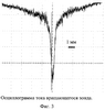 Как и в наиболее близком из рассмотренных аналогов, инициирование разряда в полом катоде осуществляется за счет обратного ионного потока, проникающего из ускоряющего промежутка через окна в аноде в разрядную область. В то же время, ограничения, накладываемые на размер ячеек сеток, перекрывающих окна, расположенные вокруг эмиссионного отверстия в аноде, существенно снижают электронную эмиссию через эти окна за счет наличия для плазменных электронов потенциального барьера, обусловленного ионным слоем, отделяющим плазму от сетки. Для ионов из ускоряющего промежутка барьер отсутствует, и они беспрепятственно проникают в разрядную область. В связи с указанными обстоятельствами эмиссия электронов из плазмы осуществляется через центральное отверстие в аноде, не перекрытое сеткой. Это позволяет осуществить эффективную фокусировку пучка, добившись в фокальной плоскости диаметра, не превышающего 1 мм. Источник работает следующим образом. По достижении в вакуумной камере давления 2-10 Па, соответствующего форвакууму, к разрядному промежутку: полый катод 1 – анод 2 подключают блок питания разряда с напряжением порядка 500 В. В этих условиях разряд не зажигается, т.е. Id=0. Затем плавно повышают напряжение Ue на ускоряющем промежутке: анод 2 – ускоряющий электрод 3. При этом в ускоряющем промежутке возникает слаботочный высоковольтный тлеющий разряд. Формируемый этим разрядом поток ускоренных ионов движется к аноду 2 и через окна 8 проникает в полость катода 1, вызывая вторичную электронную эмиссию с его стенок. Возрастание тока ионов Ii, в цепи полого катода с увеличением Ue иллюстрируется пунктирной кривой на фиг.2. При некотором значении Ue (обычно 3÷5 кВ) и соответствующем значении ионного тока Ii происходит зажигание разряда, что фиксируется в виде резкого возрастания тока Id (фиг.2). Дальнейший подъем ускоряющего напряжения до значений 15-20 кВ при включенной фокусирующей системе обеспечивает формирование остросфокусированного электронного пучка. Это подтверждается осциллограммами тока вращающегося зонда, выполненного в виде проволоки, пересекающей пучок в перпендикулярной плоскости (фиг.3).
