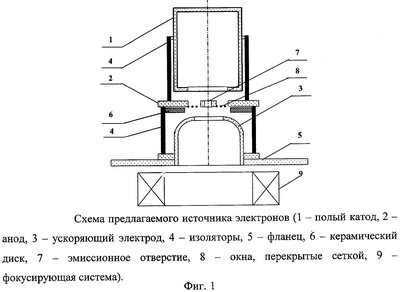 Схема предлагаемого источника электронов представлена на фиг.1. Полый катод 1, анод 2 и ускоряющий электрод 3 размещены соосно на керамических изоляторах 4, один из которых укреплен на фланце 5. Керамический диск 6 расположен между анодом 2 и ускоряющим электродом 3. Эмиссионное отверстие 7 устроено в центре анода 2 и оставлено неперекрытым. Новыми элементами по сравнению с прототипом являются: устроенные вокруг эмиссионного отверстия в аноде окна 8, перекрытые металлической сеткой с размером ячейки, меньшим радиуса эмиссионного отверстия, и фокусирующая система 9.