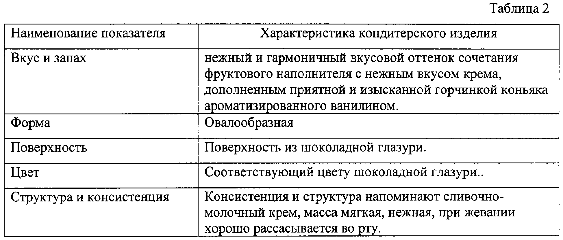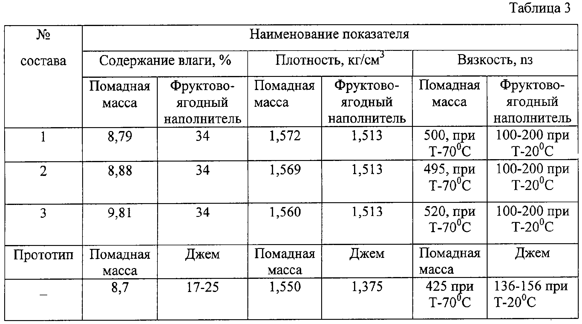 Из табл. 1-3 следует, что предлагаемая глазированная шоколадной глазурью конфета с корпусом на основе помадной массы имеет улучшенные показатели плотности, влажности и вязкости, что свидетельствует о ее улучшенных свойствах. Так, например, увеличенная по сравнению с прототипом вязкость при указанных в таблице влажности и плотности способствует лучшему сохранению формы конфеты. Таким образом, заявляемое изобретение позволяет расширить ассортимент кондитерских изделий для производства конфет с новым оригинальным вкусом и улучшенными свойствами.