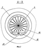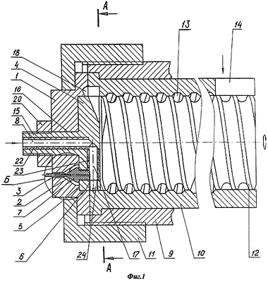 Разделительная матрица 4 в передней части выполнена с осевым посадочным стержнем 15, пропущенным через осевое отверстие 16, выполненное в выпускной матрице 1.