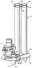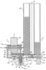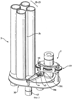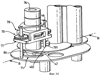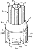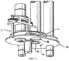 Как показано на фиг.2-5, устройство в соответствии с настоящим изобретением содержит главный стояк 30, на котором смонтирована система кассетной загрузки 2 карусельного типа, содержащая несколько загрузочных труб 20-23, расположенных вертикально и собранных вместе в закрытую орбитальную конструкцию. Каждая труба образует внутреннее вертикально ориентированное пространство, предназначенное для загрузки набора капсул, загружаемых свободно одна на другую в загрузочную трубу. Загрузочные трубы могут быть жестко соединены друг с другом, образуя относительно жесткий узел во время вращения карусельного стояка. Для этого каждая труба продольно соединена с двух сторон с соседними трубами при помощи соединительных перемычек 24. Как показано на фиг.5, загрузочные трубы соединены между собой в нижнем основании при помощи центрального соединительного средства 25, установленного в нижнем направлении по центральному осевому стержню 26, вращающемуся вместе со стояком 30. Для вращения центральной оси 26 предусмотрены приводные средства 27. Как показано на фиг.5, эти средства могут содержать зубчатые шестерни 270, 271 и электрический двигатель 272, соединенный со стояком 30. В возможном варианте выполнения приводные средства могут содержать кулачок типа «мальтийского креста», обеспечивающего точный поворот разгрузочных труб на четверть оборота.