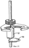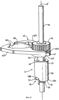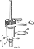 Далее следует подробное описание захватной системы 4. Как показано на фиг.8, подвижные зажимы 42 этой системы удерживаются в закрытом положении пружиной 47. Пружина действует упругим усилием на противоположные части 420, 421 захватных элементов 422, 423 подвижных зажимов таким образом, чтобы приближать их друг к другу и формировать тем самым опорную зону 48 для капсулы 90. Под подвижными зажимами 42 находятся средства управления 5 открытием и закрытием зажимов. Средства управления установлены с возможностью скольжения в картере 54, жестко соединенным со стояком 30 (показанным на фиг.5 и 7). Стержень 46 установлен с возможностью вращения в основании картера, с одной стороны, он продолжен кверху для участия в приведении в движение вытяжного устройства, что будет описано ниже. Подвижные зажимы 42 удерживаются в положении упора в нижнюю поверхность запорной пластины 40 при помощи прижимной пружины 59, установленной в картере. Под действием пружины и в отсутствие обратного толкающего усилия подвижные зажимы 42 остаются практически в контакте с запорной пластиной 40. Как будет изложено ниже, толкающее усилие, действующее на подвижные зажимы 42, предусмотрено для управления открытием зажимов в определенных конкретных условиях.