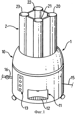 Вытяжное устройство в соответствии с настоящим изобретением, показанное на фиг.1, является машиной для раздачи кофе и/или других напитков, предназначенной для приготовления напитков путем вытяжки пищевого вещества, содержащегося в заранее дозированных капсулах. Устройство содержит шкаф 10, форма которого отвечает как эстетическим, так и функциональным требованиям и который заключает в себе основные элементы системы вытяжки, отбора и управления устройством. В задней части шкафа находится система кассетной загрузки 2, оборудованная несколькими трубами 20, 21, 22 и 23, содержащими наборы подлежащих опорожнению капсул. В передней части шкафа оборудована зона обслуживания 11, содержащая стационарную подставку 12 для одной или нескольких емкостей, в которые разливают напиток. Пульт управления 13 выполнен в передней части шкафа и оснащен клавишами, обеспечивающими выбор напитка, соответствующий различным вариантам капсул, находящихся в устройстве кассетной загрузки. Некоторые клавиши могут также соответствовать возможным смесям напитков, получаемым из нескольких выбранных капсул. Электропитание устройства обеспечивается по электропроводу 15, а вода подается по водопроводу 16.