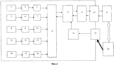 Для фиг.2 введены следующие обозначения: 1 – датчики электродермальной активности, на которых наводятся вызванные кожные вегетативные потенциалы (эти датчики располагаются на поверхности рук обследуемого пациента), 2 – усилители биопотенциалов для электродермальной активности со встроенным фильтром (низких частот) НЧ, 14 – аналого-цифровой преобразователь со встроенным мультиплексором 4 и источником опорного напряжения 19, на который кроме указанных сигналов поступают сигналы от пьезоэлектрического датчика дыхания 5, прошедшие через усилитель сигнала 6 со встроенным фильтром НЧ 7, и от датчиков электрокардиографии 8 через усилитель сигнала электрокардиографии 9 со встроенным полосовым фильтром 10. Аналого-цифровой преобразователь 14 соединен со входом микроконтроллера 15, первый цифровой выход которого соединен с управляющими входами аналого-цифрового преобразователя 14, а второй цифровой выход через блок гальванической развязки 20 соединен с преобразователем интерфейса 21 и персональным компьютером 22. Устройство дополнительно содержит два электромиографических датчика 11, соединенные через усилители сигнала биоэлектрической активности мышц 12, фильтры сигнала биоэлектрической активности мышц 13 и через мультиплексор 4 с аналого-цифровым преобразователем 14. Также устройство дополнительно снабжено датчиком фотоплетизмографии 16, сигнал от которого, прошедший через усилитель сигнала фотоплетизмограммы 17 со встроенным полосовым фильтром 18 через мультиплексор 4, поступает на аналогово-цифровой преобразователь 14. Блок питания прибора 23 осуществляет питание прибора и подключен через USB порт к персональному компьютеру 22. Блок гальванической развязки 20 обеспечивает безопасность испытуемого во время исследования от перенапряжения до 4 кВ.