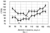 После чего определяют минимальное значение скорости распространения пульсовой волны и соответствующее давление в манжетке. Статистически установлено, что для пациентов с дисплазией соединительной ткани и, как следствие, со сниженным тонусом артериальной стенки сосуда минимум зависимости СРПВ-давление находится в пределах 75-85 см/с (Фиг.3, кривая 10). В случае повышенного тонуса сосудистой стенки значения СРПВ составляют 95-105 см/с (Фиг.3, кривая 9). По полученным данным сопоставляют тип нервной регуляции и тонус сосудистой стенки и в случае сочетания ваготонии и пониженного тонуса сосуда определяют группу риска, для которой существует потенциальная опасность коллапсоидных осложнений при резких физических нагрузках.