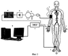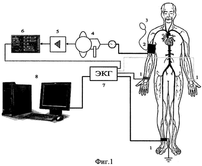 Электроды 1 подключены к аппарату ЭКГ 7, а затем через USB-порт к компьютеру 8. Пневматическая манжетка для измерения артериального давления 2, с пневматическим нагнетателем 3 через манометр подключена к датчику давления 4, соединенному с усилителем 5 и преобразователем 6. Преобразователь 6 подключен к одному из входов аппарата ЭКГ 7.