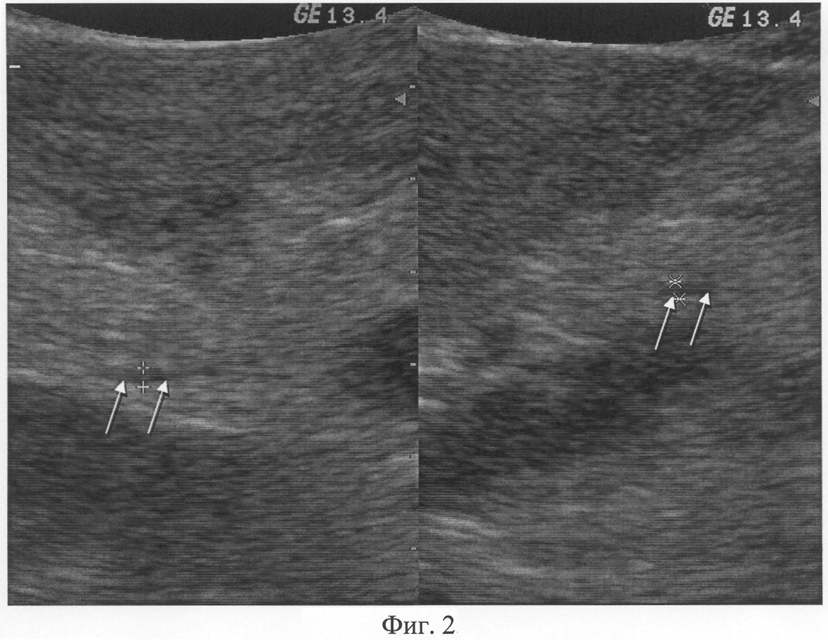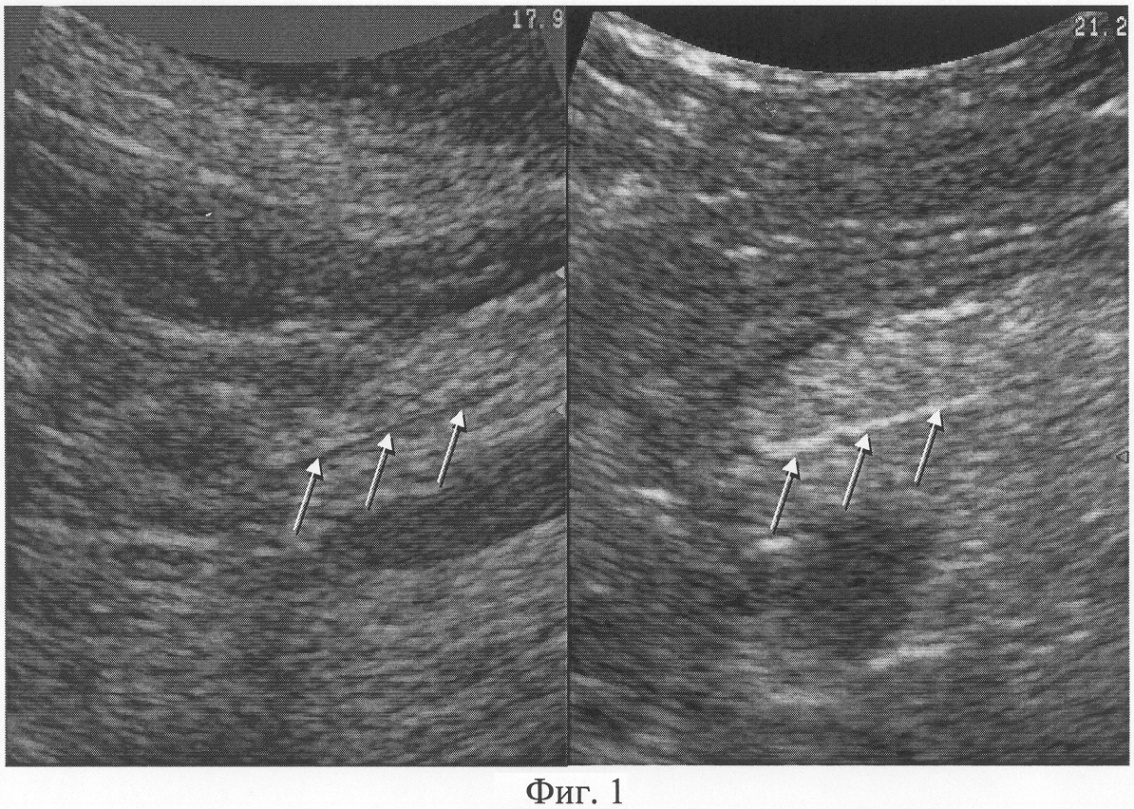 При осуществлении ультразвукового исследования согласно предлагаемому способу, были выявлены следующие параметры. Исходно: в просвете главного панкреатического протока на всем протяжении визуализируется однородное анэхогенное содержимое; просвет нисходящего отдела двенадцатиперстной кишки умеренно дилятирован, содержимое неоднородное за счет крупнодисперсной гиперэхогенной взвеси. Осмотр после контрастирования: максимальный диаметр просвета поперечного сечения двенадцатиперстной кишки составляет 25 мм, в ее просвете определяется однородное гиперэхогенное содержимое (контрастное вещество); в просвете дистального отдела главного панкреатического протока определяется однородное гиперэхогенное содержимое (контрастное вещество). Заключение: Дуоденопанкреатический рефлюкс (фиг.2).