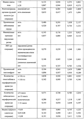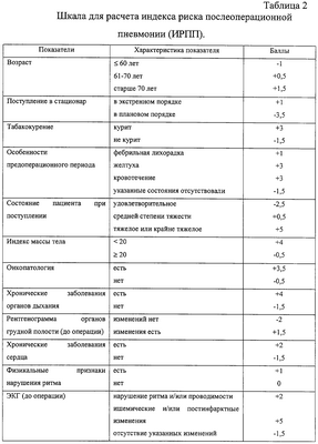 -13 прогнозируют низкий риск развития послеоперационной пневмонии, при -13<ИРПП<+13 – умеренный риск, а при ИРПП>+13 – высокий риск развития послеоперационной пневмонии. Способ позволяет повысить точность прогнозирования данного осложнения за счет выделения трех степеней риска: высокой, умеренной и низкой на основании расчета индекса риска послеоперационной пневмонии. 3 табл.