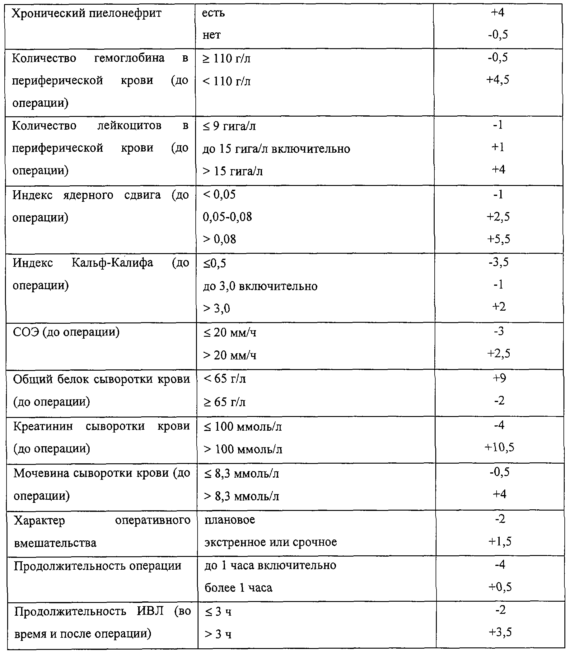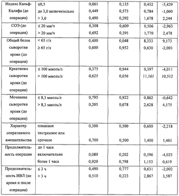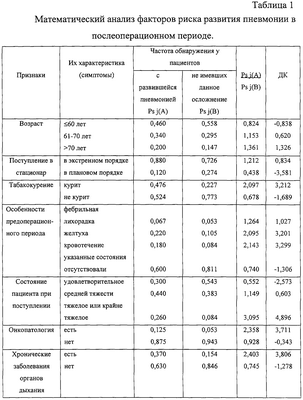 Изобретение относится к медицине, а именно к внутренним болезням. Проблема госпитальных пневмоний остается чрезвычайно актуальной. Это обусловлено высоким уровнем заболеваемости и летальности, трудностями клинической и микробиологической диагностики. В медицине предвидение какого-либо заболевания часто опирается на данные о факторах риска его развития. Не является исключением и госпитальная пневмония. Важное место среди перспективных направлений прогностики как науки занимает использование математических методов, кибернетики и вычислительной техники. Весьма распространены подходы, связанные с применением элементов теории вероятности, в частности формулы статистической проверки гипотез Байеса, последовательного статистического анализа Вальда. За прототип нами выбран способ прогнозирования исходов острой пневмонии, описанный З.К.Трушинским и соавт. (Трушинский З.К., Воробьев Л.П., Соловьев В.М., Климович С.К., Швецова Д.Ф. О применении математического метода прогнозирования исходов острой пневмонии. – Советская медицина, 1978, №4, с.35-40). В работе З.К.Трушинского для комплексной оценки прогноза исхода острой пневмонии использован метод последовательного анализа Вальда. Предварительно отобрано 13 прогностических показателей, каждому из которых присвоен условный балл (от -10 до +7). Сумма баллов, рассчитанная для каждого больного, образует прогностический индекс пневмонии (ПИП). При ПИП<-13 исход заболевания считается неблагоприятным (смерть, абсцедирование), при ПИП>+13 – благоприятный, а при – 13<ПИП<+13 – неопределенный. При ПИП>25 имело место легкое течение пневмонии, а при 14<ПИП<25 – среднетяжелое. Общим нашего способа со способом, описанным З.К.Трушинским, является: использование метода последовательного анализа Вальда; отбор прогностических показателей на основании данных о частоте их встречаемости в двух группах наблюдения; использование шкалы для расчета прогностического индекса. Технический результат предлагаемого “Способа прогнозирования развития послеоперационной пневмонии” заключается в повышении точности прогнозирования данного осложнения за счет выделения трех степеней риска: высокой, умеренной и низкой, на основании расчета индекса риска послеоперационной пневмонии (ИРПП). С целью определения значимых факторов риска и разработки шкалы прогностических показателей было проведено изучение и сравнение двух групп пациентов. Первую группу составили больные (50 человек), у которых после оперативных вмешательств на органах верхнего этажа брюшной полости развилась пневмония (случай рассматривался только при условии развития пневмонии не ранее чем через 48 часов после поступления в стационар, и при рентгенологическом подтверждении диагноза). Вторую группу составили пациенты (95 человек), у которых после аналогичных оперативных вмешательств пневмония отсутствовала. Методы исследования включали: физикальное обследование и целенаправленный сбор анамнеза, исследование периферической крови (общий анализ крови) и биохимических показателей крови (общий белок, креатинин, мочевина, билирубин), ЭКГрафию, рентгенологическое исследование органов грудной полости, определение показателей внешнего дыхания (ЖЕЛ, ФЖЕЛ, ОФВ1, индекс Тиффно, ПОС, пневмотахометрия, пневмотонометрия, проба Штанге-Генче). Изначально к ра