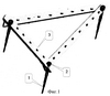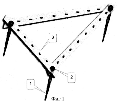 Способ поясняется чертежами. На фиг.1 изображена конструкция в общем виде, состоящая из трех стержней для остеосинтеза длиной 120 мм (фиг.1, поз.1), шести гаек (фиг.1, поз.2) и трех балок из набора Г.А.Илизарова длиной 335 мм (фиг.1, поз.3)