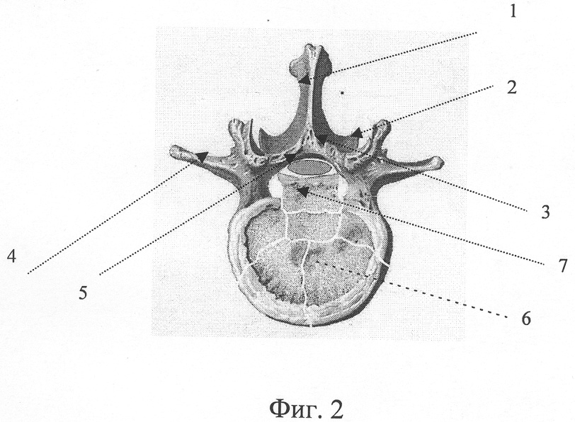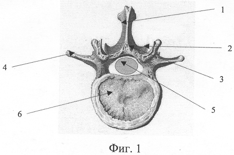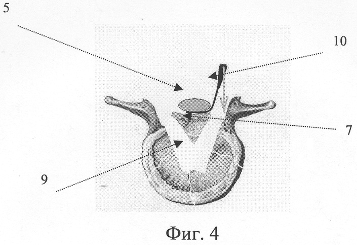 Скелетирование остистых отростков, дуг и области межпозвонковых суставов нужно выполнять достаточно тщательно для точной визуализации анатомических структур. Прежде чем выполнить ламинэктомию заинтересованного позвонка, необходимо резецировать нижние суставные отростки и каудальную часть остистого отростка вышележащего позвонка. Это обеспечит достаточный угол операционного действия при декомпрессии. Осуществив ламинэктомию в межсуставной части позвонка (прямыми кусачками пистолетного типа с рабочей часть небольших размеров), можно удалить дугу, нижние суставные отростки и остистый отросток компремированного позвонка единым блоком. При этом необходимо иссечь желтые связки и капсулы суставов, соединяющие поврежденный позвонок с нижележащим. При проведении ламинэктомии таким образом достаточно широко обнажают заднюю поверхность дурального мешка. В ране при этом остаются боковые части дуги. Долотами или кусачками проводят резекцию медиальных частей боковых дуг и корней дуг поврежденного позвонка. Деликатно при помощи мозгового шпателя дуральный мешок смещают кнутри и подвергают резекции медиальные части боковых дуг вплоть до задних отделов тела позвонка (Фиг.1, 2, 3). Вышеописанные манипуляции проводят с двух сторон.