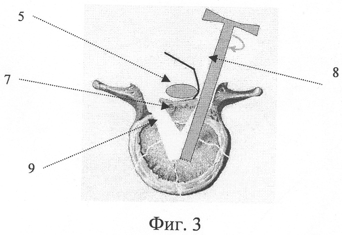 фиг.3 – схема расположения фрезы при рассверливании задних отделов тела позвонка;