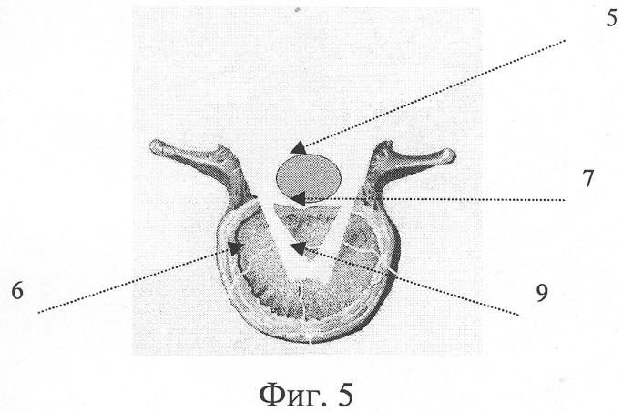 Устранение переднего сдавления проводят за счет удаления (высверливания) задних отделов тела позвонка корончатыми фрезами. Направление фрезы при этом меняют, что позволяет создать достаточный по объему дефект (приблизительно равный объему интраканальных структур) в заднем отделе тела позвонка (фиг.4). Медиальную ретракцию спинного мозга при этом выполняют деликатно, во избежание избыточного растяжения или отрыва корешков или других элементов спинного мозга. Удаление фрагментов, сдавливающих спинной мозг, выполняют при помощи выкусывателей или конхотомов. При этом учитывают, что дуральный мешок уже натянут за счет пролабированного в канал отломка(ов). Возникающее во время этого этапа кровотечение из перидуральных вен ликвидируют за счет применения турунд, смоченных в растворе перекиси водорода и биполярной термокоагуляции. При наличии сформированного фрезами дефекта под интраканальным отломком возможно импакторами-репонаторами устранить стеноз за счет смещения его в вентральном направлении и вдавливания (импакции) отломков в тело поврежденного позвонка (фиг.5). В случае применения методов стабилизации, предусматривающих натяжение задней продольной связки, будет также реализован дополнительный момент репозиции. Предпочтительно применить транспедикулярный остеосинтез, который позволяет осуществить трехплоскостную репозицию, межтеловую первичную фиксацию и компенсирует ятрогенную потерю элементов заднего опорного комплекса.