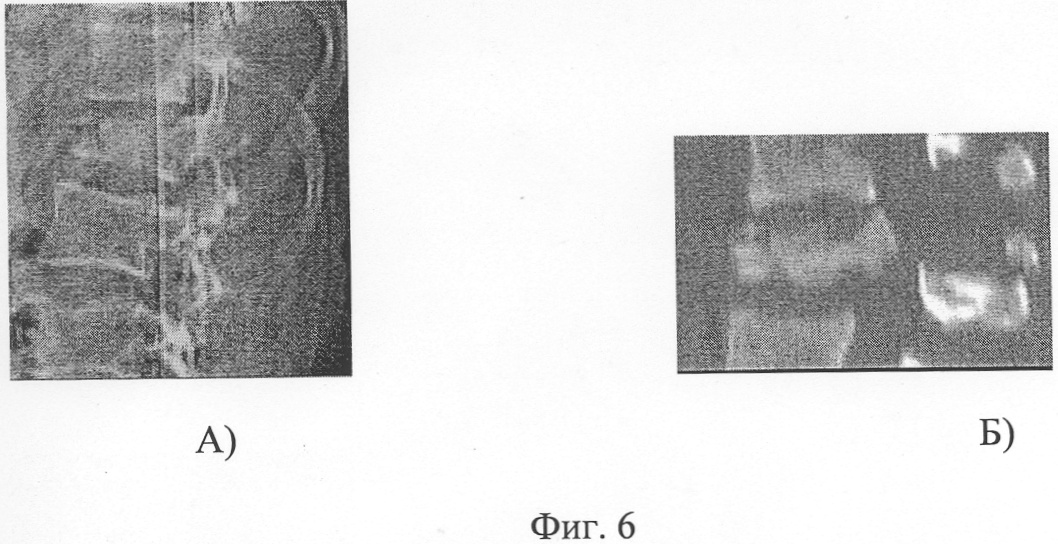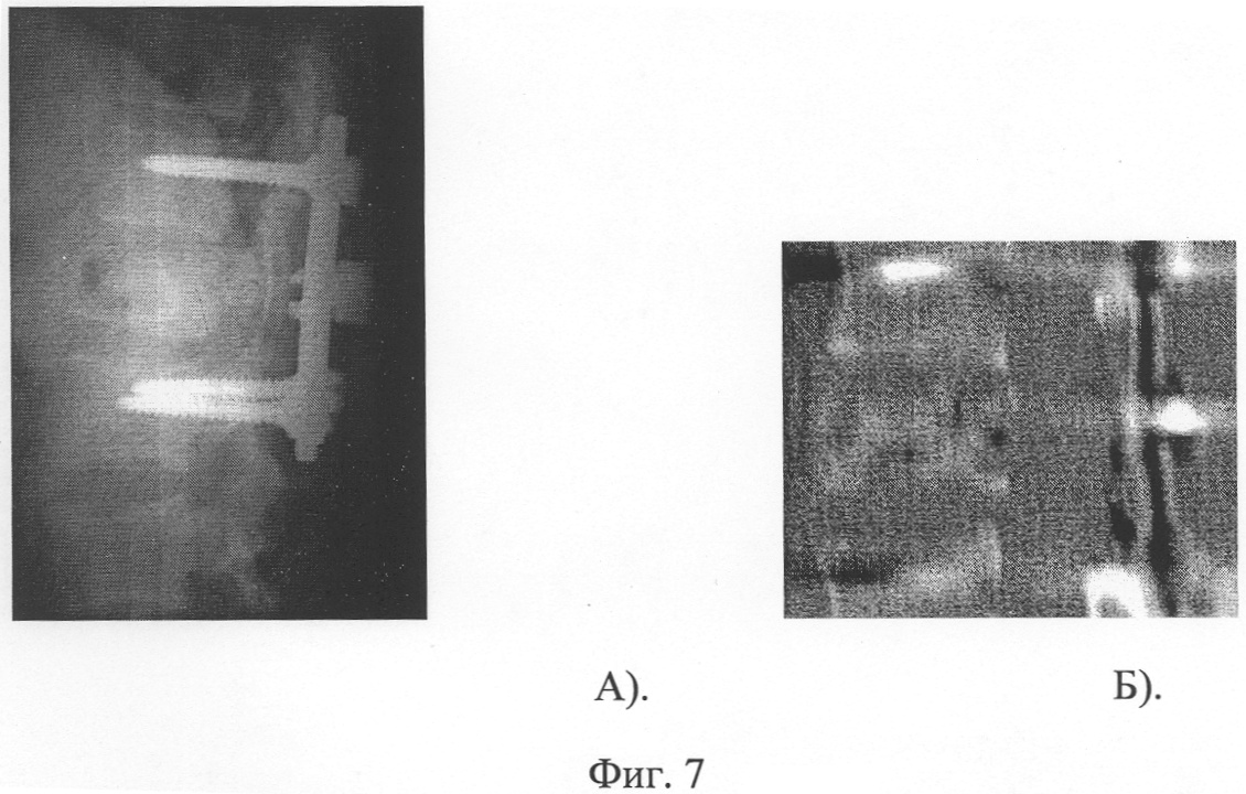 Транспедикулярная фиксация ThXII-LII позвонков конструкцией элементами из никелида титана. Рана зажила первичным натяжением. В ближайшем послеоперационном периоде наблюдался выраженный регресс неврологической симптоматики (переход из группы В в Д) (Фиг.6 и 7).
