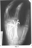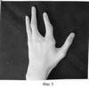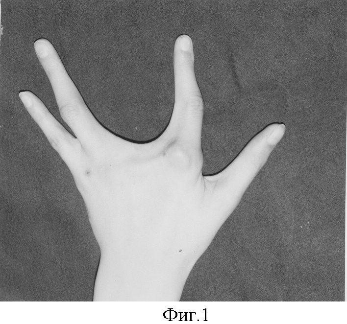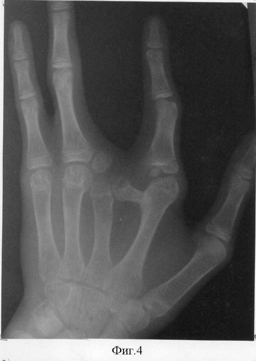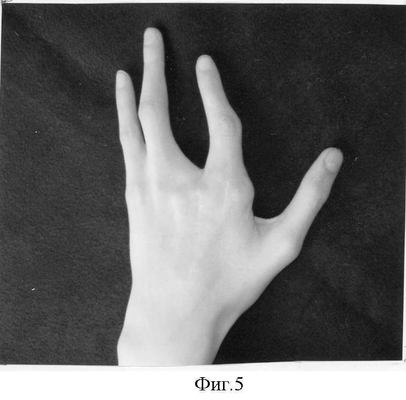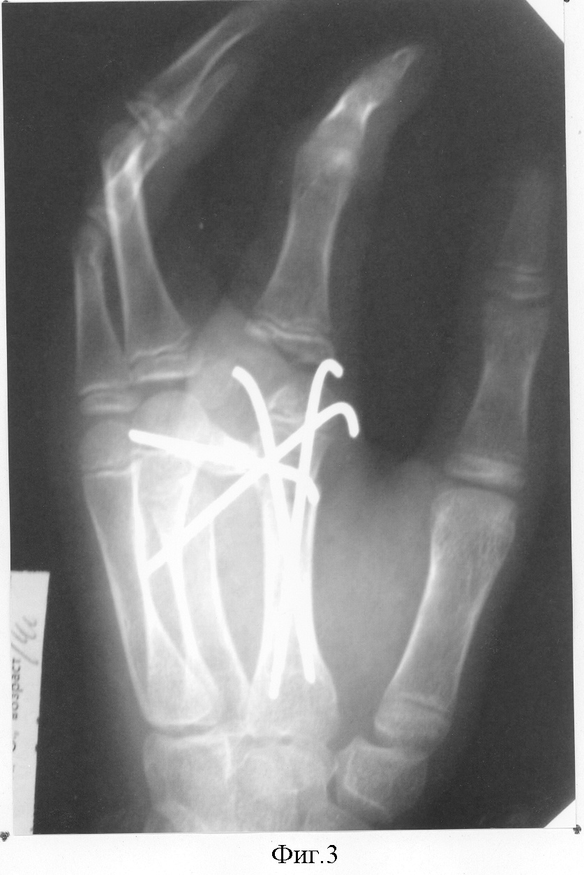 29.05.03 г. в отделении хирургии кисти НИЦТ «ВТО» выполнена операция по вышеописанной методике: ракетообразный разрез по расщелине кисти, с тыльного доступа вычленена головка дополнительной поперечной кости со второго пястно-фалангового сочленения, смещены навстречу друг другу вторая и третья пястные кости до достижения анатомической ширины кисти. Приложив дополнительную поперечную кость с тылу второй пястной кости, определена необходимая длина этой кости, подлежащая удалению. После этого удален лучевой конец дополнительной поперечной кости. Под головкой поперечно перепилена вторая пястная кость, и второй палец вместе с головкой пястной кости ротирован до функциональной позиции второго пальца по отношению к кисти. Достигнутое положение костей фиксировано спицами (фиг.3). Послойные швы на рану. Спиртовая повязка. Гипс до снятия кожных швов. Заживление раны первичным натяжением. Спицы удалены через 2 мес. Контрольный осмотр через 1,5 года. Достигнута хорошая анатомическая структура и улучшилась функция кисти (фиг.4,5).