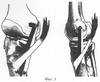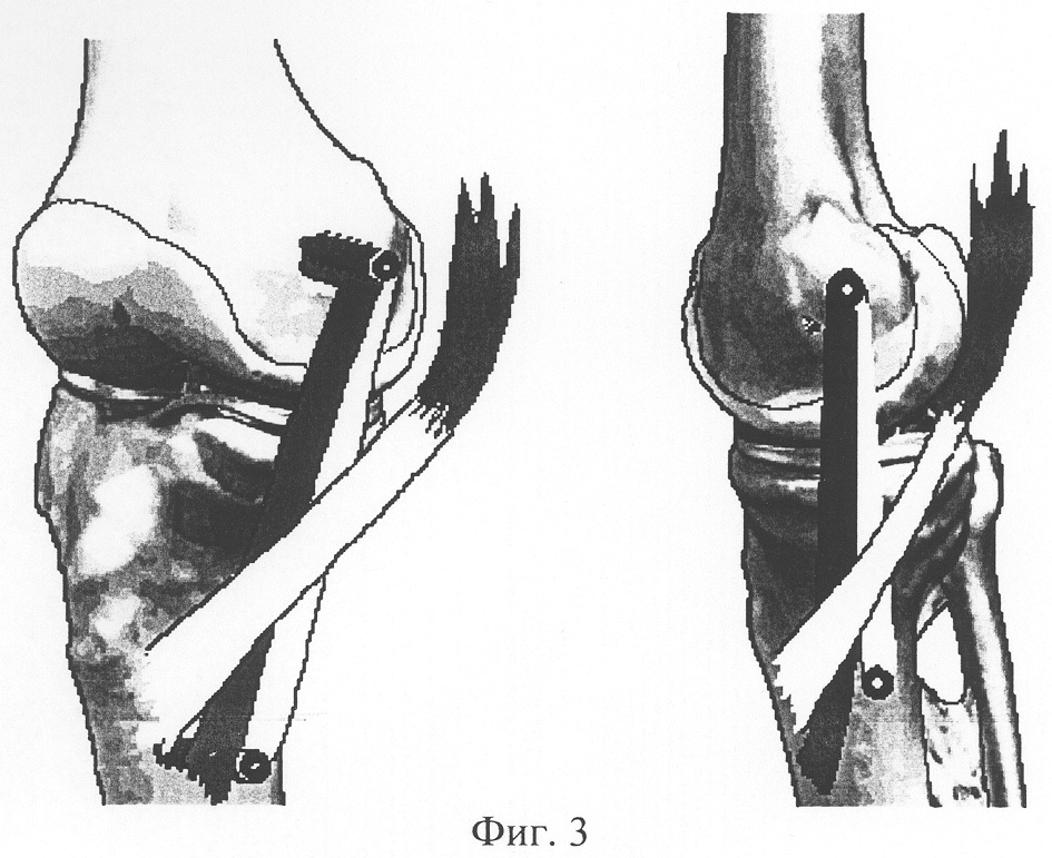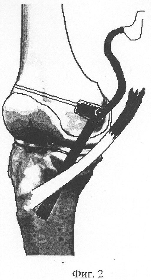 На фиг.1 изображены проекции кожных разрезов в медиальной области коленного сустава; на фиг.2 – проведение трансплантата; на фиг.3 – окончательный вид после пластики.
