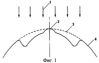 Под частью поверхности роговицы 2, подлежащей удалению, понимается участок роговицы определенной формы, подвергаемой воздействию лазерного излучения 1 и удаляемый в результате этого воздействия.