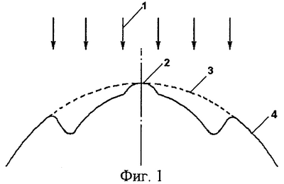 Под частью поверхности роговицы 2, подлежащей удалению, понимается участок роговицы определенной формы, подвергаемый воздействию лазерного излучения 1 и удаляемый в результате этого воздействия.