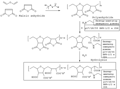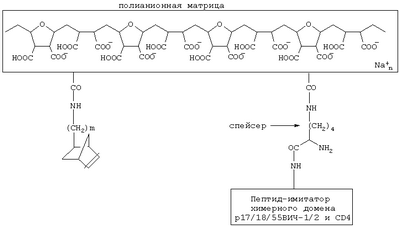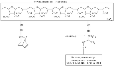 – объединение в единый макромолекулярный комплекс пептидов-имитаторов химерного домена структурного белка р17/18/55 ВИЧ-1/2 и V1 клеточного рецептора CD4 и полианионной матрицы.