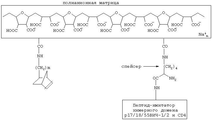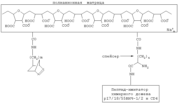 Преимущества предлагаемого способа по сравнению с известным заключаются в том, что комплексные соединения, включающие в свой состав полианионную матрицу, модификатор Норборнен/Норборнан и пептид-имитатор химерного домена белка р17/18/5 5 ВИЧ-1/2 с белком клеточного рецептора CD4, обеспечивают доставку комплексного вакцинного препарата к месту развития инфекции ВИЧ-1/2 и подавлению специфической ВИЧ-инфекции за счет включения в структуру препарата, фармакофора модификатора и химерных пептидов, которые в сравнении с прототипами вызывают модификацию основных протективных антигенов ВИЧ-1/2 и индукцию специфического иммунного ответа, а также воздействуют на репродукцию ВИЧ в пермессивных клетках и оказывают выраженный противовирусный эффект на более широкий круг вирусов-мишеней, причем включая азидотимидин резистентные штаммы ВИЧ. Данный препарат, помимо химиотерапевтического действия на течение ВИЧ-инфекции, обеспечивает стимуляцию продукции цитокинов и клеток киллеров с модуляцией В-, Т-клеточного звена иммунитета и стимуляцией выработки специфических антител, обладающих нейтрализующими свойствами в отношении вируса иммунодефицита человека.