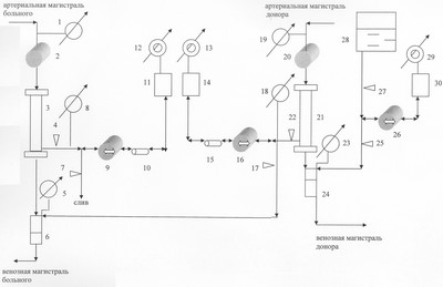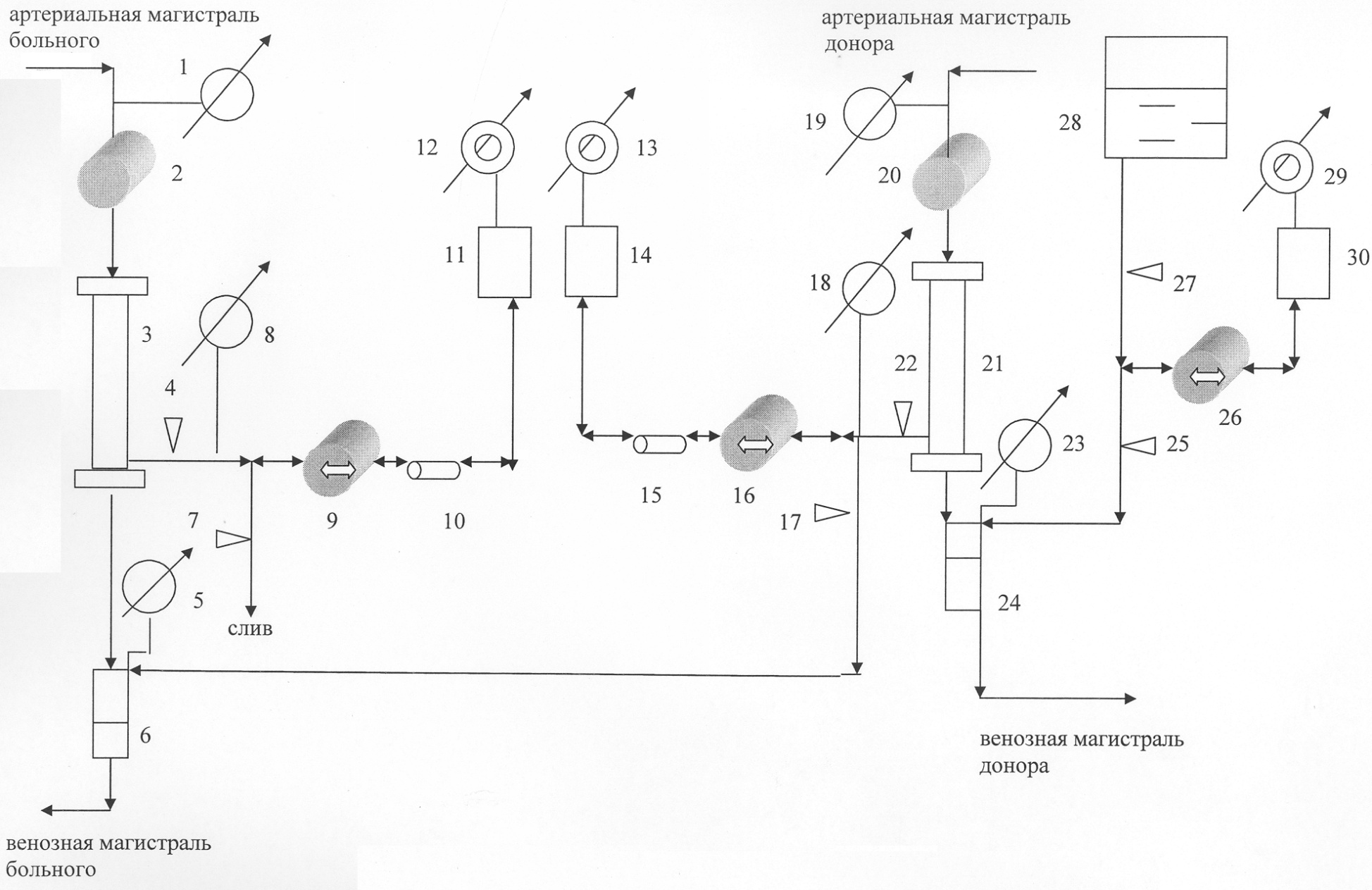 Кровь больного перфузируют насосом крови 2 через массообменник больного 3 и через венозную ловушку воздуха 6 возвращают обратно в кровяное русло больного. Мановакуумметры 1 и 5 контролируют артериальное и венозное давление в контуре экстракорпорального кровотока больного. Кровь донора перфузируют насосом 20 через массообменник донора 21 и через ловушку воздуха 24 возвращают обратно в кровяное русло донора. Мановакуумметры 19 и 23 контролируют артериальное и венозное давление в контуре экстракорпорального кровотока донора. Цикл гемофильтрации у пациента начинается с того, что одновременно включают насосы 9, 16 и 26. Насос 9 через открытый электромагнитный клапан 4 под контролем мановакуумметра 8 убирает из массообменника больного 3 гемофильтрат. Гемофильтрат больного через индикатор прорыва мембраны 10 подают в измерительную емкость 11, установленную на весах 12. По достижении заданного веса гемофильтрата насос 9 останавливают. Одновременно насос 16 через открытый электромагнитный клапан 22 под контролем мановакууметра 18 убирает из массообменника 21 гемофильтрат донора. Гемофильтрат донора через индикатор прорыва мембраны 15 подают в измерительную емкость 14, установленную на весах 13. По достижении заданного веса гемофильтрата насос 16 останавливают. Параллельно насос 26 через открытый электромагнитный клапан 27 заполняет измерительную емкость 30, установленную на весах 29, замещающим раствором из емкости 28. По достижении заданного веса насос 30 останавливают. После остановки всех трех насосов электромагнитные клапаны 4, 22 и 27 закрывают, а электромагнитные клапаны 7, 17 и 25 открывают. Насосы 9, 16 и 26 переключают на реверс. Насос 9 откачивает гемофильтрат больного из измерительной емкости 11 на слив. Насос 16 перекачивает гемофильтрат донора из измерительной емкости 14 в ловушку воздуха больного 6. Насос 26 перекачивает замещающий раствор из измерительной емкости 30 в ловушку воздуха донора 24. По обнулении весов 12, 13 и 29 клапаны 7, 17 и 25 закрывают и цикл повторяется. Таким образом, обеспечивают стабилизацию веса больного и донора в процессе лечения больного.